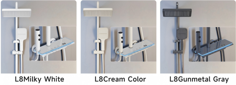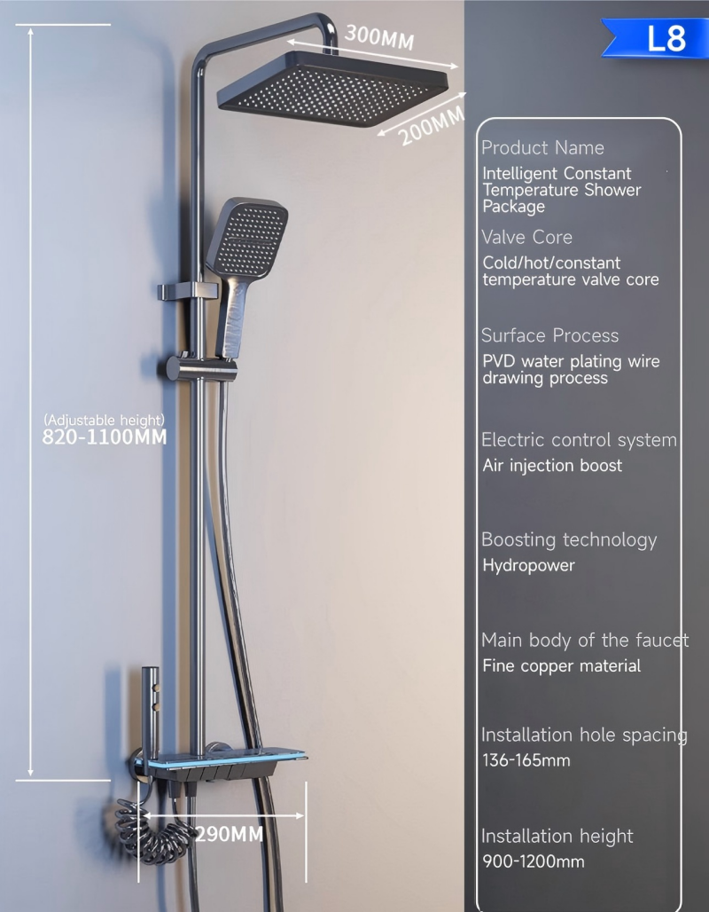 This smart thermostatic shower system combines premium craftsmanship and intelligent functionality to elevate your daily bathing experience.Crafted with a thickened brass body, it guarantees long-lasting durability, scratch resistance, and wear resistance. The advanced constant temperature control maintains your desired water temperature consistently, eliminating sudden cold or hot water shocks for safe, comfortable showers.